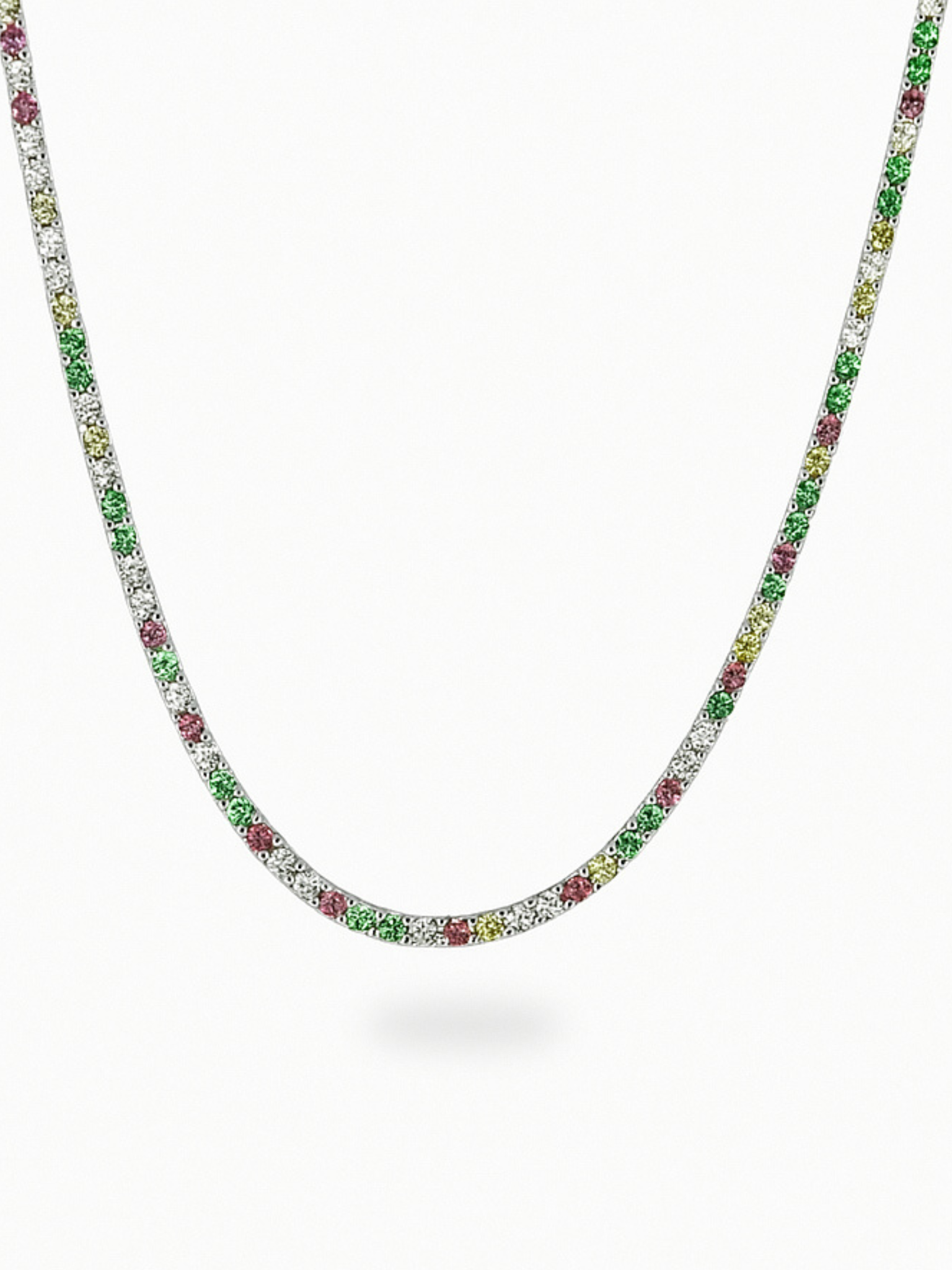 Este deslumbrante colar de prata 925 apresenta um design clássico de estilo Riviera, adornado com zircônias coloridas que capturam a luz e adicionam um toque vibrante a qualquer visual. Cada pedra é meticulosamente posicionada, criando uma linha contínua de brilho e sofisticação. Ideal para ocasiões especiais ou para dar um toque de elegância ao dia a dia, este colar combina a beleza atemporal da prata com o charme das zircônias multicoloridas, proporcionando um look sofisticado, alegre e repleto de personalidade. Perfeito para quem busca um acessório que transmite luxo e estilo sem exageros.