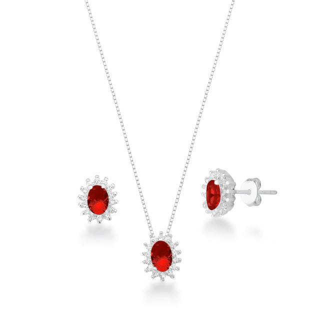 O Conjunto Oval Cravejado com Pedra Vermelha é uma joia marcante que combina a elegância da prata 925 com a intensidade e sofisticação da pedra vermelha. Composto por colar e brincos, este conjunto apresenta um design oval cravejado com zircônias brilhantes, que destacam a beleza da pedra central. Perfeito para ocasiões especiais ou para quem deseja adicionar um toque de glamour ao dia a dia.